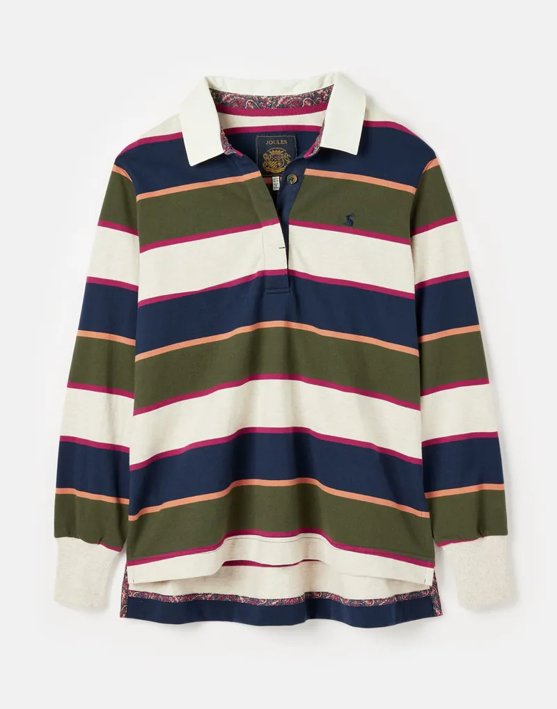 Try as you might, we don’t think you’ll find a better rugby shirt than this. Crafted from our finest heavyweight jersey that’s perfect for the colder months ahead, this long sleeved shirt features dropped shoulders, deep cuffs, a stylish woven stripe and contrasting printed details to the inside neck, outer collar and inner back hem. The front fastens with concealed buttons and has an embroidered Joules hare to the chest.Love to layer? Then style this top over a white shirt or blouse (as shown).