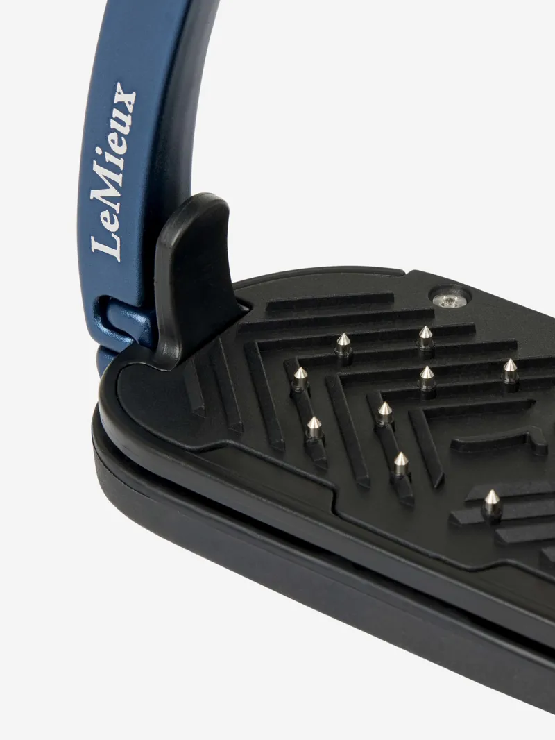 An integrated hinged arm has a two-stage release system, preventing unintentional opening. The spring loaded arm locks into the base of the main frame meaning that when under maximum pressure, such as landing over a fence, the rider’s weight is spread evenly across the stirrup, preventing the outside dropping and flexing. When pressure is put onto the arm of the stirrup, the arm releases allowing the foot to come out of the stirrup and minimising the risk of it getting stuck. The stirrup arm breakout force = 36N (equivalent to 3.62kg) in testing meaning enough resistance to stop it opening unintentionally, but will release when needed.