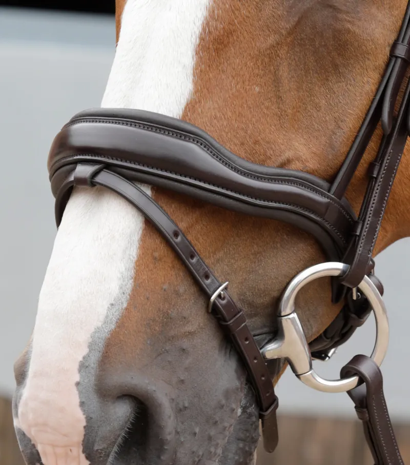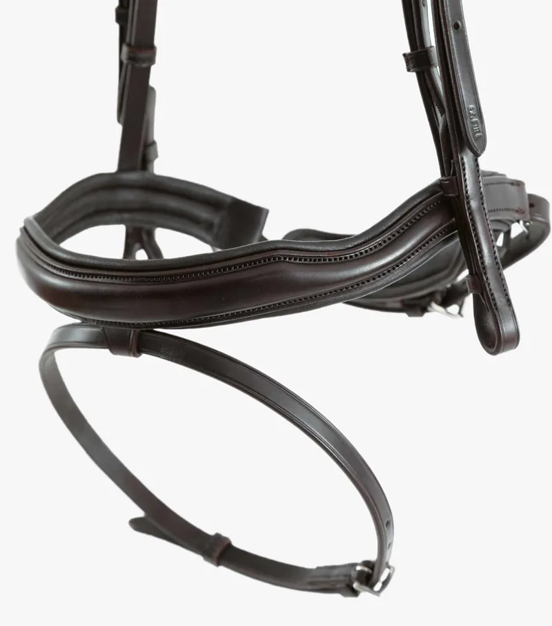 Constructed using high quality Italian leather this anatomic bridle has been carefully shaped to contour around the horse’s ears, nose and cheekbones in order to achieve a more comfortable and ergonomic fit. The anatomically shaped, padded poll piece is designed to distribute pressure over the less sensitive areas of the poll and away from the ears. The browband is also shaped to create definition and features a round raised design alongside soft padding.
