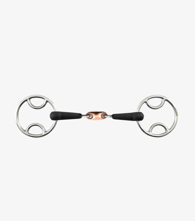 Bevel bits allow mild leverage and offer a little more control, promoting responsive and correct head carriage. The double jointed, durable rubber mouth piece with copper lozenge offers a higher level of comfort in the horse’s mouth. Copper lozenges help to distribute pressure over both the tongue and bars of the mouth, encouraging mouthing and contact. It also helps to prevent pinching of the lips and around the bars of the mouth whilst reducing the nutcracker action of a single jointed bit. Ideal for horses that need a touch more braking power but are perhaps sensitive in the mouth.