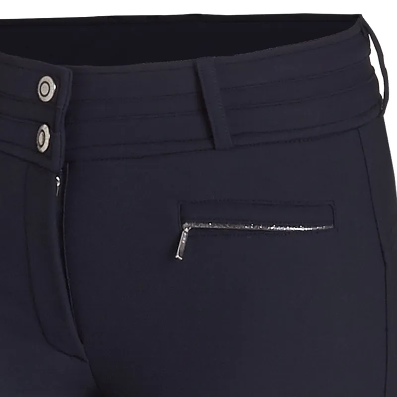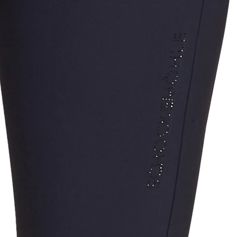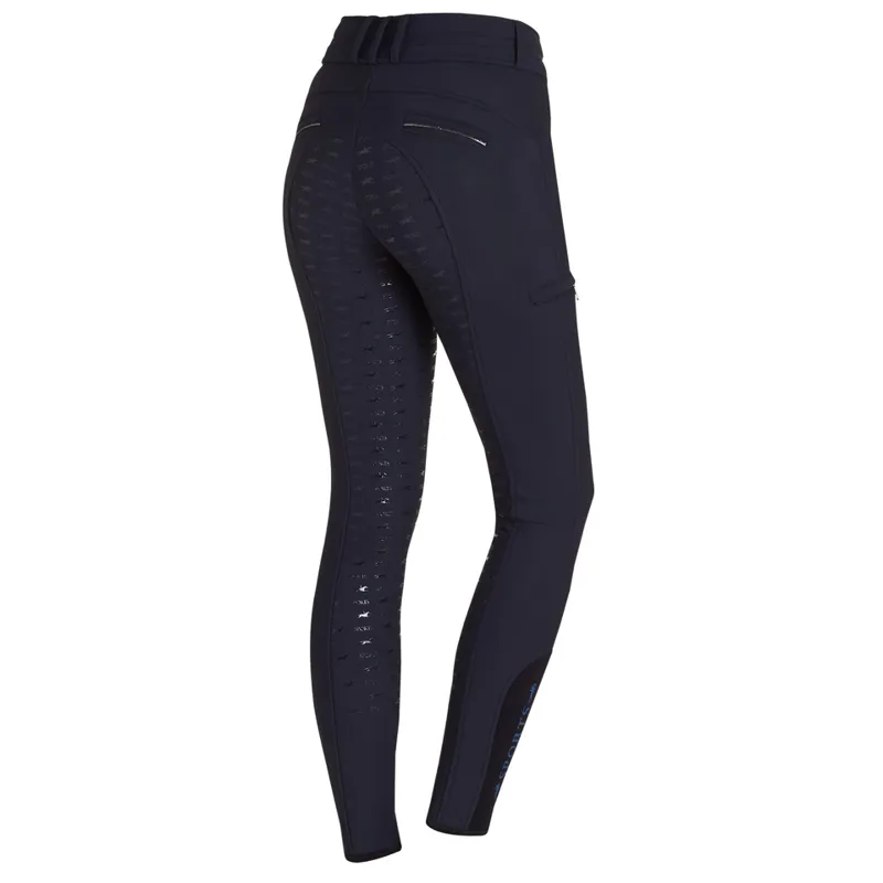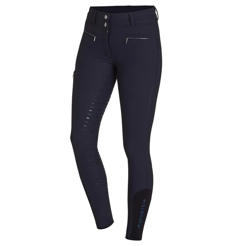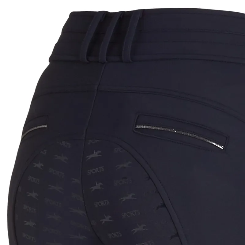 Cold days can come – because with the premium winter breeches Winter Heather Style FS by Schockemöhle Sports low temperatures won´t harm you anymore. The warm design made from stretch material provides a lot of freedom of movement, nevertheless, it retains its shape and is figure flattering. The necessary grip in the saddle is provided by a non-slip full seat silicon print. A mobile phonepocket at the side and elastic leg gathers are ranked among the functional details. The logo rhinestone motif plus a shaped yoke in the back make thisbreeches optically attractive as well.